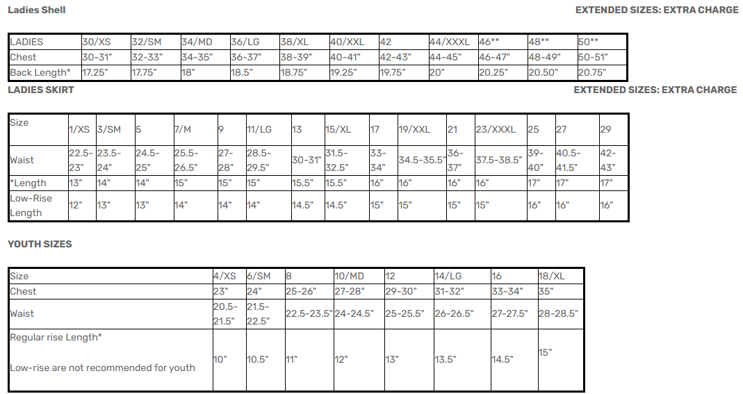 Order the custom vest or add the pictured skirt to receive special kit pricing for the full uniform. Vests can be made with a solid or stretch back at no additional charge. Uniforms will be made with the same color patterns as shown on the chosen uniform selection. For example, all locations shown in Purple will change to the new selected color. For sizing, please refer to the sizing charts shown below. Additional information can be found on our Custom Uniform Information page, the link to which can be found in the quick links at the bottom of the page.